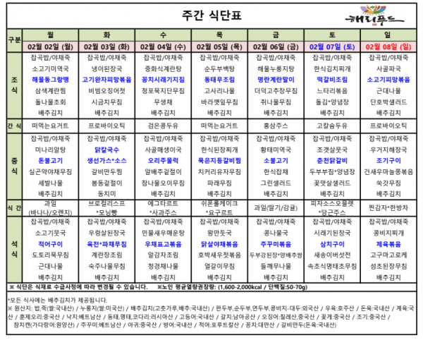 2월 첫째주 식단표 페이지 정보 작성자 은천노인복지회 작성일26-02-04 11:48 조회303회 댓글0건 관련링크 이전글 다음글 목록 답변 본문 2월 첫째주 어르신 식단표 안내해 드립니다. 정성과 영양을 담아 준비하겠습니다. 이전글 다음글 목록 답변